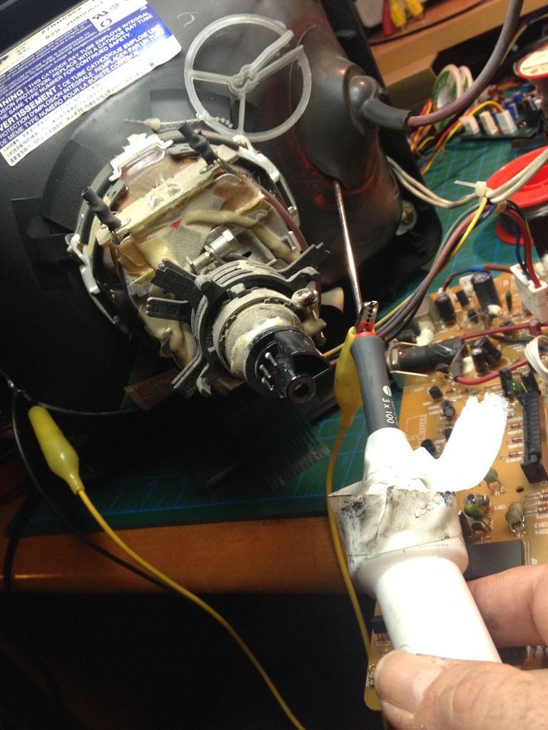 CRT TV'leri discharge etmek kolay. Önce TV'yi fişten çekiyorsunuz. Sonra uzunca bir metal'i (örn. ince bir tornavida - bkz foto) TV'nin çevresine sarılı çıplak tel'e bağlıyorsunuz. Sonra bu metali çıplak teninizden izole bir şekilde (örn. kısa bir PVC su borusu dirseği) TV tüpünün arkasındaki vantuzun (anode kablosu) arasından sokup kontak noktasına değdiriyorsunuz. Ekranın büyüklüğüne ve açık kalma süresine göre çıt, çat veya paaat diye bir ses duyuyorsunuz (Bundan cızırt diye bir ses çıkabildi ancak)