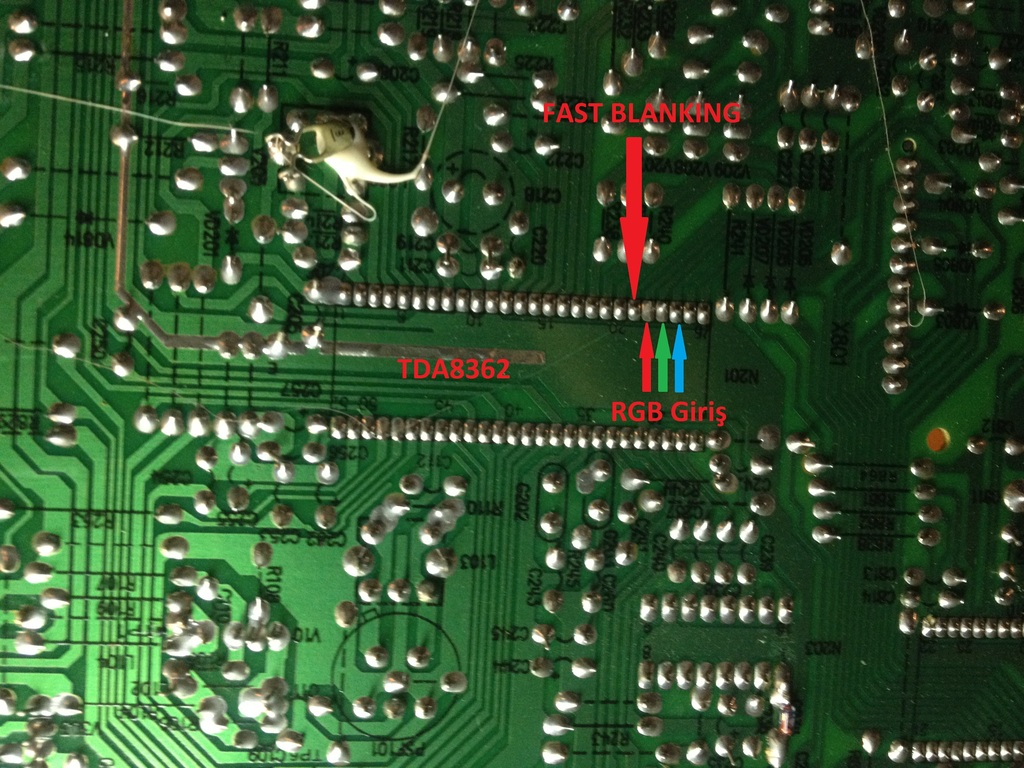 Hemen internetten TDA8362 kullanan ve RGB SCART girişi olan bir başka TV şasesinin devre şemasını buldum (bu entegre oldukça yaygın olarak kullanılıyor bu arada). Orada SCART girişinden hatları TDA8362'nin GND'a bağlı bacaklarına kadar takip ettim ve bu elimdeki TV'yi RGB modlamak için gerekenleri artık anladım