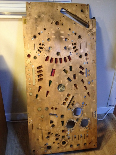 Devre kartlarından sonra sıra üzerinde lambaların ve gösterge panellerinin bulunduğu “Insert Board” a geldi. Bunun da backbox'da tutan menteşelerini söküp yere aldım. Bu ahşap pano'nun üzerinde 37 adet küçük lamba, 17 adet büyük lamba, 5 adet ayrı bir türde lamba (sanırım bunların ışığı azalıp çoğalarak kıpraşıyor) ve bir de röle kartı var.