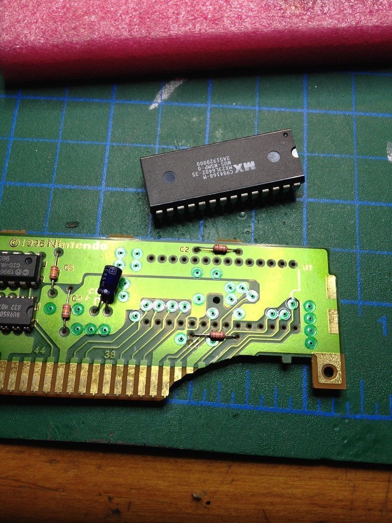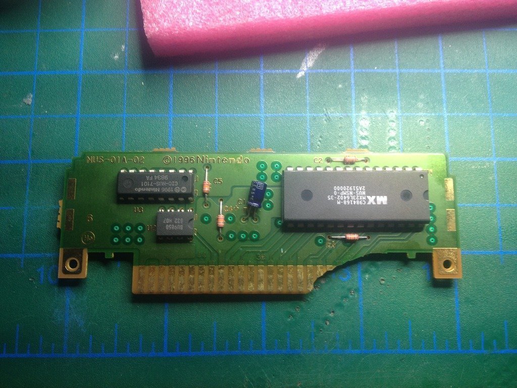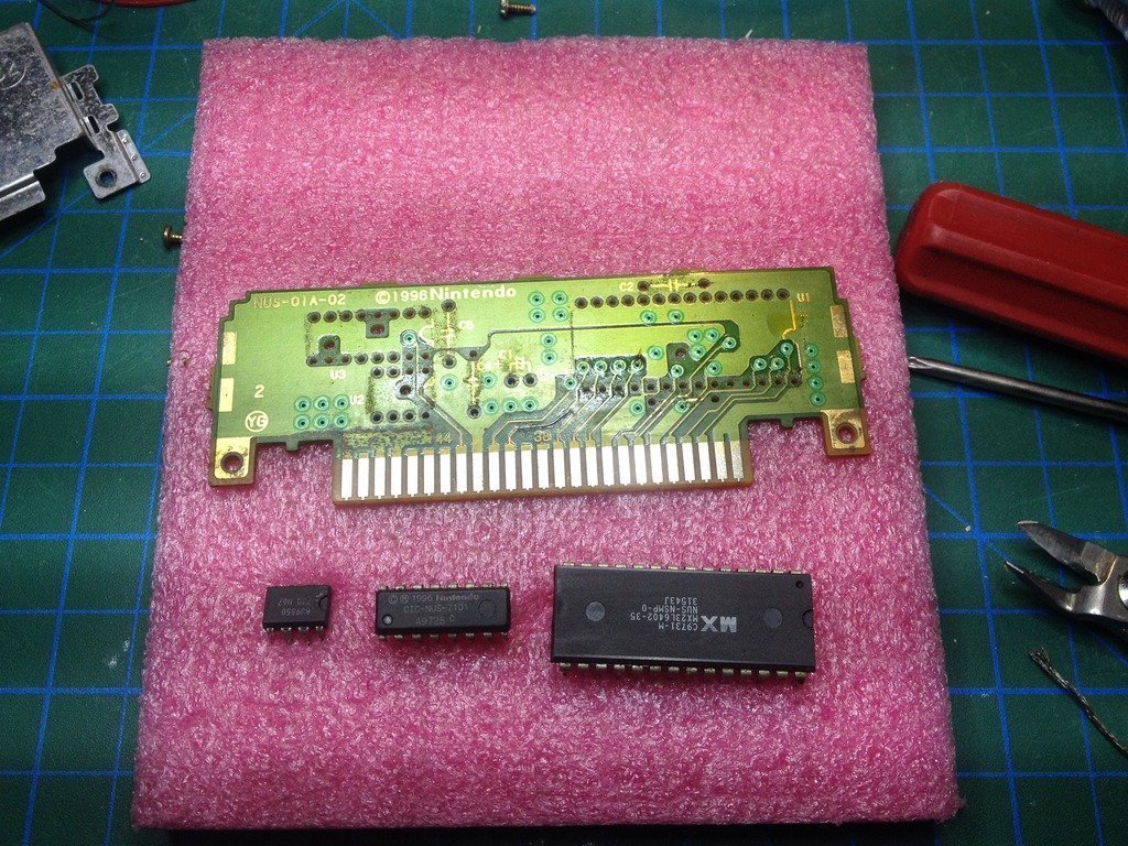 Nintendo Matronix firmasına özel olarak yaptırmış bu ROM'ları. Üzerinde MX23L6402-35 yazıyor ama internette bilindik endüstri standardı bir bacak dizilimi olmadığı gibi içinde özel bir takım bileşenler de var sanırım. Çok N64 uzmanı değilim ama google'da ilk sayfada N64 ve bu çiple ilintili bir şey bulamadıysanız bilgi ya çok derinlerde ya da sadece birilerinin kafasındadır