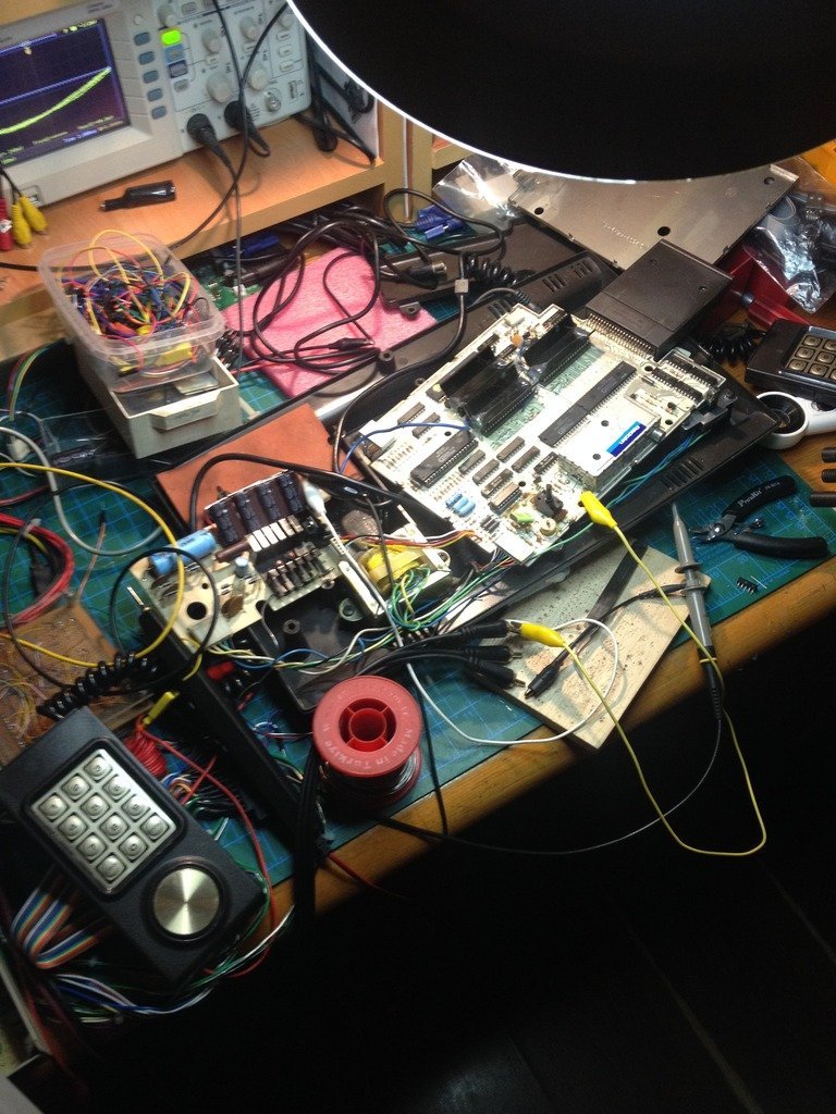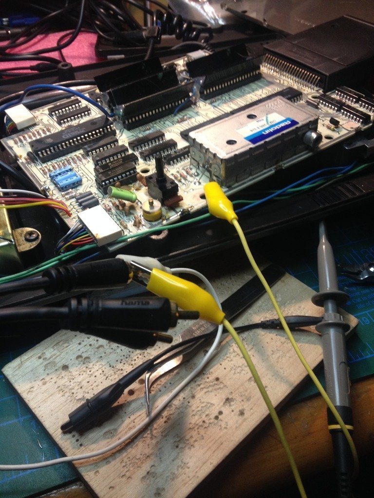 Çalışma masamda RF girişi olan bir TV'nin yokluğunu hissediyorum ancak TV olmadan da cihazın çalışıp çalışmadığını osiloskop ile test etmek mümkün. Bunun için osiloskopu ana kartın üzerinden composite video olduğunu tahmin ettiğim bir yere bağlıyorum (Oric, Spectrum v.s. tamiratlarımda da benzer şekilde test ediyorum).