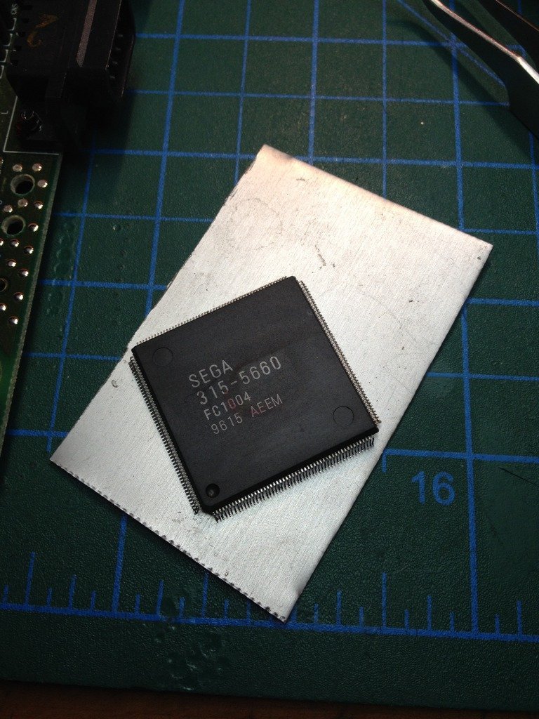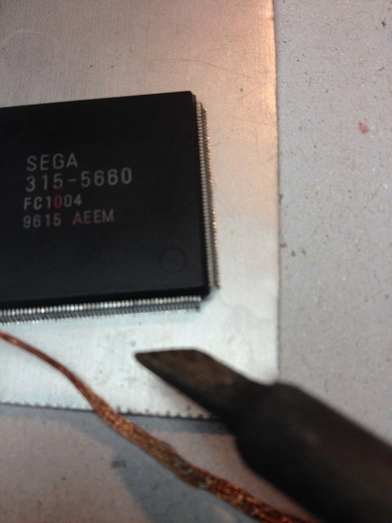Üflemeli havya ile 5 dakika sonra entegre masanın üzerinde. Her zaman bir parça aluminyum plaka bu tarz sökme operasyonlarından sonra yanınızda bulunsun. Sökülen parça çok sıcak olacağından hem masanızı yakmazsınız hem de parça hızlıca soğur.