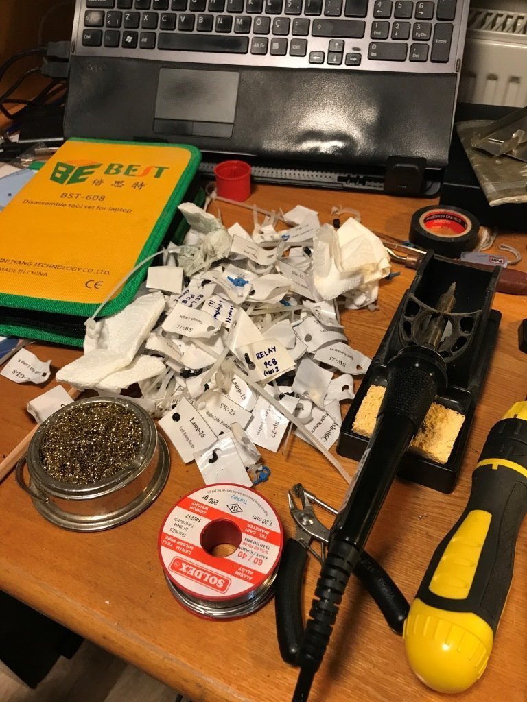 Diğer tüm o kaotik yüzlerce kabloyu, solenoid'lere giden 15 çift kablo dışında tek tek yerlerine lehimledim. Bunun için eski fotoğraflar ve 3 sene önceki bağladığım etiketleri olmasaydı muhtemel ya yapamazdım ya da çok deneme yanılma yapmam gerekirdir.