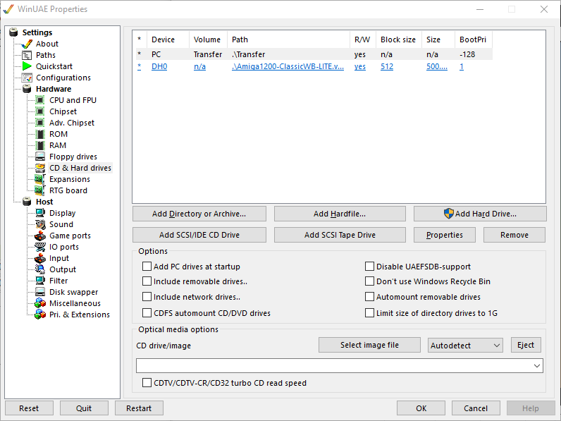 Öncelikle Amiga1200-ClassicWB-LITE.bat dosyasına sağ tıklayarak Yönetici olarak çalıştır diyoruz. Eski rehberlerde karşınıza çıkacak disableharddrivesafetycheck parametresi artık gerekmiyormuş, WinUAE'yi yönetici olarak çalıştırmak yetiyormuş. Bu sayede WinUAE sürücümüze direk ulaşıb RDB biçiminde boot sektörü ve bölümler oluşturabiliyor. ClassicWB açılacak, F12 tuşuna basıp CD & Hard drives sekmesinde Add Hard Drive... tuşuna basıyoruz.