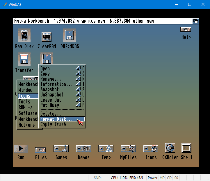 DH0_0:NDOS bölümüne sağ tıklayıp açılan menüden Icons seçeneği üzerine geliyoruz ve Format Disk... seçeneğine tıklıyoruz.