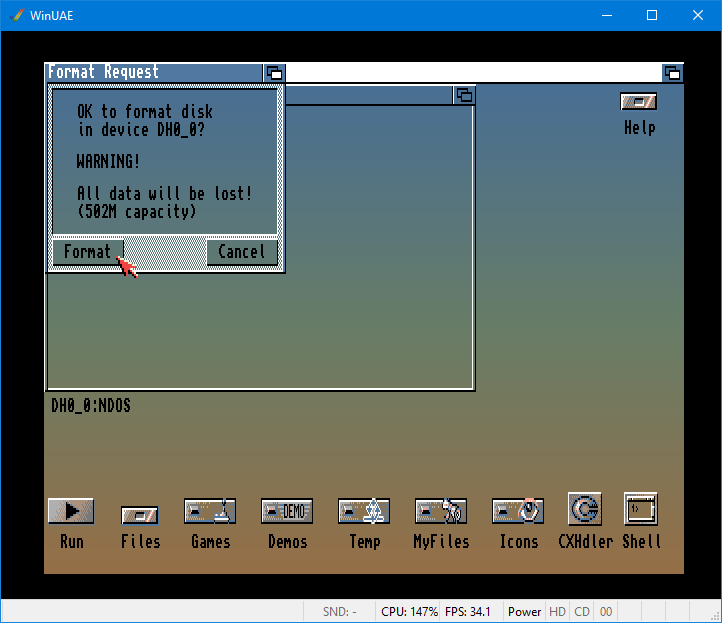 DH0_0:NDOS, DH1:NDOS ve DH2:NDOS bölümleri masaüstünde belirecek. Bunlardan DH0_0: aslında bizim DH0: ama sanal Amiga'mızdaki HDD imajının da ismi DH0: olduğundan sistem ismini o şekilde değiştiriyor. Bu HDD gerçek Amiga'ya takıldığında böyle bir sorun olmayacak.