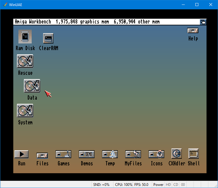 Sanal Amiga'mıza reset atıyoruz, ama bu sefer Early Startup'a girmiyoruz. Ben reset atmadan önce gerçek Amiga'daki düzeni oluşturabilmek için Transfer sanal sürücüsünden de kurtuluyorum. DH0: otomatik olarak aktif hale gelecek ve bu sefer masaüstü simgeleri Rescue bölümündekilerden kurtulduğumuzdan tek olacak.