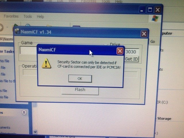 Bu aşamada oyunu atmıyoruz!!! Çünkü karta IDE modunda eriştiğimizden NaomiCF uygulaması kartı önce unmount edip (yani sanki çıkartıp) sonra format atacak ki kart şu an IDE modunda takılı olduğundan bu işlemi yapar yapmaz Windows hatayı basıyor...