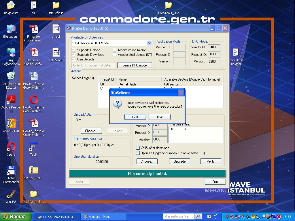 USB kablosu ile yükleyecekseniz dfuse kullanmanız gerekiyor.