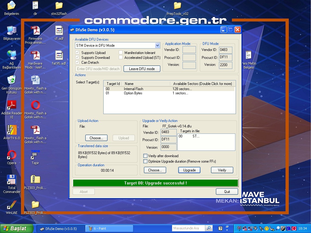 Available DFU Devices menüsünde Gotek sürücümüzü görmemiz gerekiyor. Eğer yoksa, DFUSEDemo programını kapatın, USB kablosunu PC den çıkarıp yeniden takın.  Programı çalıştırın ve listede sürücümüzü göreceksiniz. (Gotek üzerindeki reset pinlerini kontak yapmak ta işe yarar)