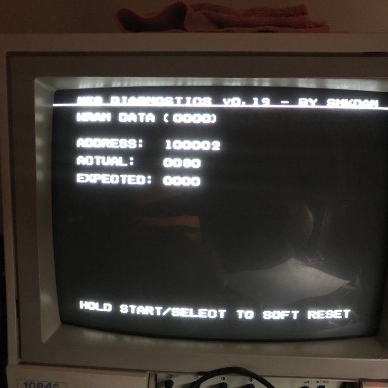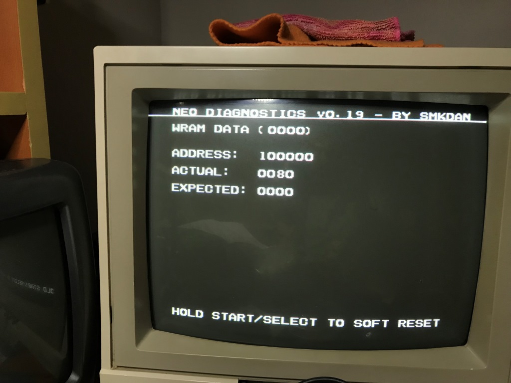 Diagnostic BIOS'u yazan arkadaşa şükürler olsun ki azıcık bir kodla kartı çalıştırıp hatalarını sırayla test ediyor. Ancak takıldığı yerde duruyor ve diğer testlere devam etmiyor. İlk olarak takıldığı yer WRAM. Yani "Work RAM". NEO GEO kartı bir bilgisayara benzetirseniz WRAM, BIOS'dan sonra ilk kullanılan sistemin ana hafızası diye düşünebilirsiniz ve hex 10000'den sonra başlıyor. Bu hata mesajından da WRAM'e ilk erişiminde hata aldığını görüryoruz, adres 10000...