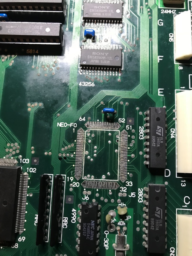 Neyse, devam ediyorum ve NEO-F0'a geliyorum. Bu eleman çevre birimleri ile (butonlar, kollar, kredi gösteren LCD paneller hatta marquee'lerin arkasındaki ışıkları yakan devrelere de sinyaller buradan gidiyor v.s.) iletişimden sorumlu. Dolayısıyla eğer bişeyler yanmışsa bu cephenin en önündeki çip diyebiliriz.