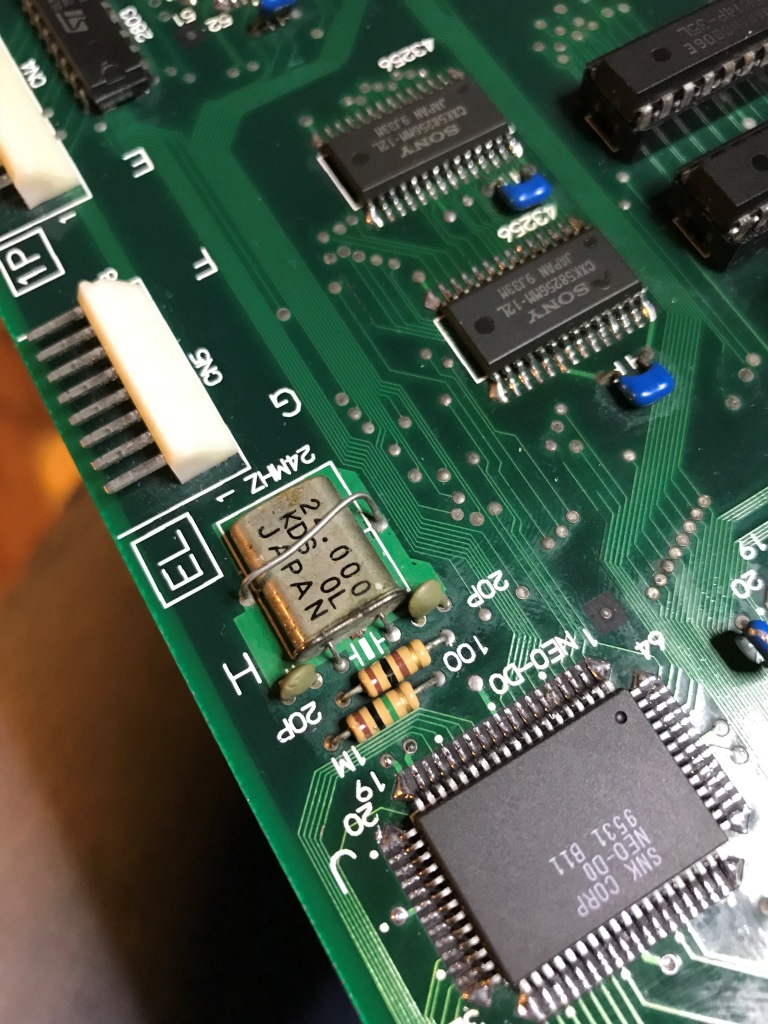 Bu model Neo Geo'da 24Mhz'lik hazır bir osilatör kullanmak yerine bu klasik kristal osilatör devresini oluşturmuşlar.