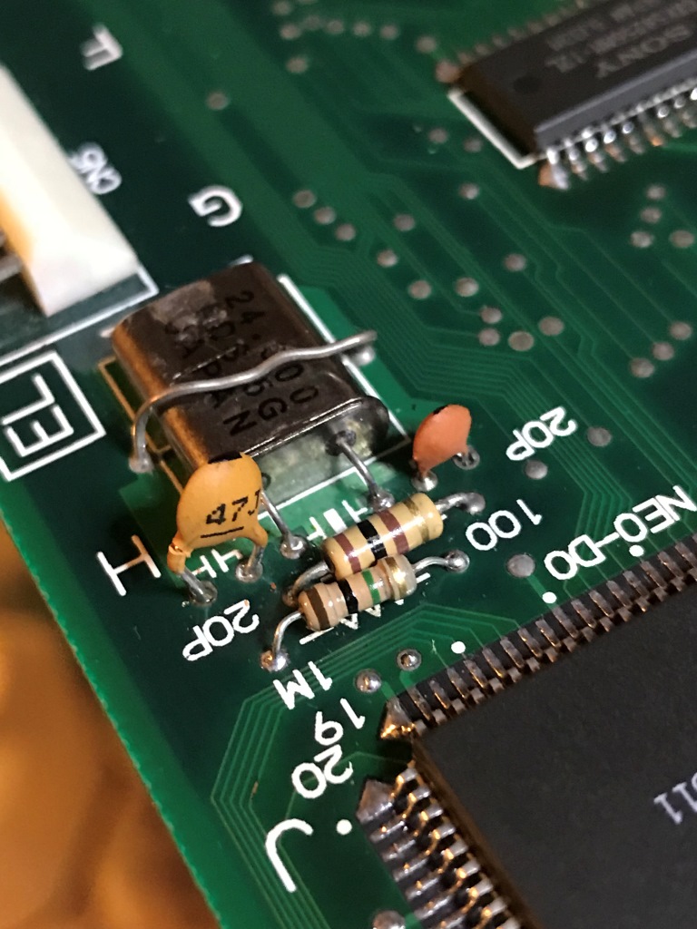 Bu sayede mevcut kullanılan 20pF'lık kondansatörün değeri 40pF'a çıkmış olacaktı. Bu muhtemel osilasyon frekansında az da olsa bir sapmaya sebep olacaktı teorik olarak (Zamanında bir yerlerde Sega Mega Drive 60Hz modu yapınca renk sinyalinin TV'nin anlayacağı seviyeye getirilebilmesi için osilasyon kısmına bir ayarlı kondansatör bağlanan bir yazı okumuştum)