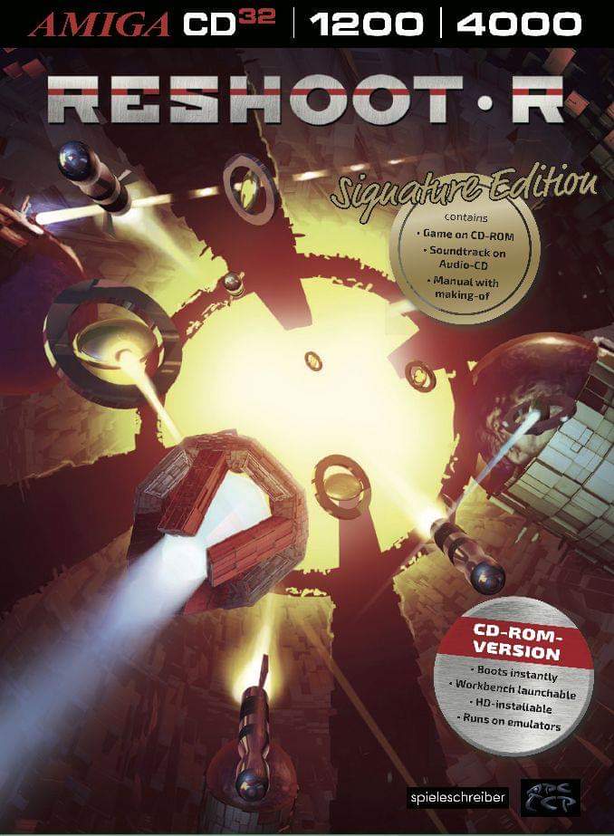 After almost three years of development RESHOOT R finally lights up its laser cannons - as you'd expect, for original Amiga hardware. The horizontal scrolling Shoot'em-Up, in the style of classics like "R-Type", throws the player into an exciting space battle. In five elaborately designed themed worlds, fighter pilots fight side-by-side with the courageous space hero Aryn against the attacks of the evil Tars species.