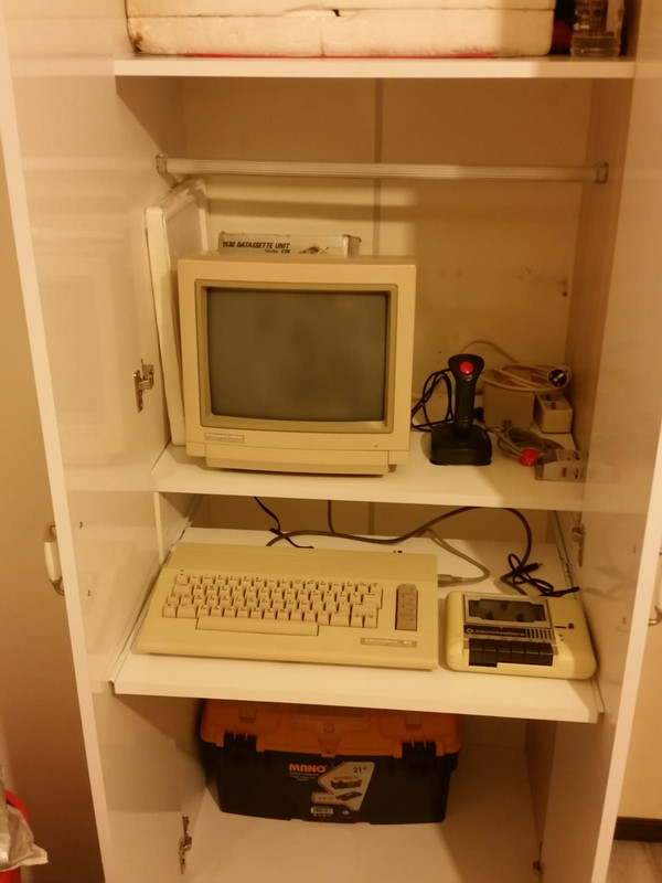 Ben de geçen hafta boş bir zaman bulup 1084 ve C64 için dolabımın içine bir raf ve klavye rafı tasarladım. Bu şekilde hem toz ve hem de eve gelen küçük yaramaz çocuklardan elimdeki cihazları koruyorum.
