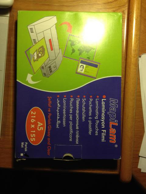 Bu sefer aklıma başka bir şey geldi. Şablona neden "laminasyon" yapmıyordum? Hani şu kimlikleri kaplarlar ya... Zaten elimde patlamış bir laminasyon aletim de vardı. Ancak kullanacağım laminasyonun çok ince olması gerekiyordu. Bu yüzden hem A5 boyutlarında poşet şeklinde, hem de çok ince bir laminasyon filmi aradım.