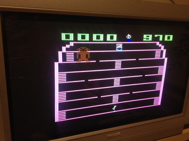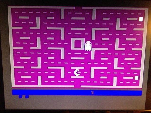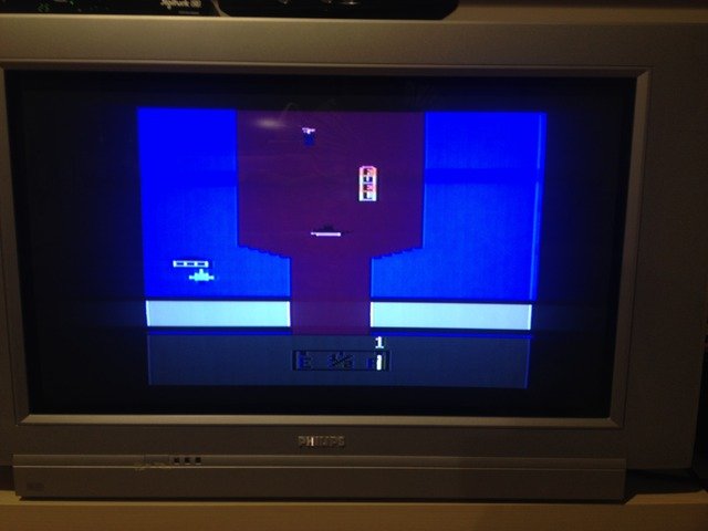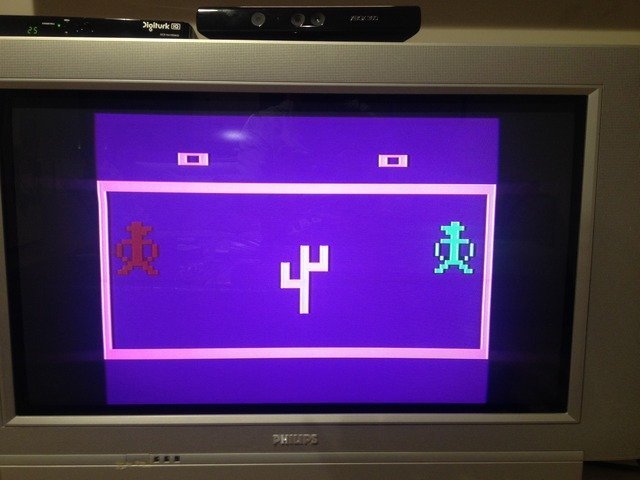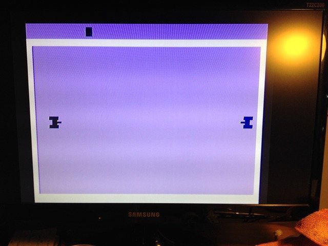 Renksiz olmasına rağmen görüntü hiç fena değil. Ancak renksiz olmasının yanısıra ses de bozuk geliyor. Neden sonra anlıyorum ki Pin 9'dan gelen sinyali Atari 2600 devresinden ayırdığımız için orijinal devrede normalde bir pull-up direnç ile +5V'a bağlı olan open-collector TIA chroma ucu benim devrede öylesine havada yüzerek 74HC4050'ye girdiğinden hem kendini hem de 4050'yi beraberinde retro cennetine götürdü