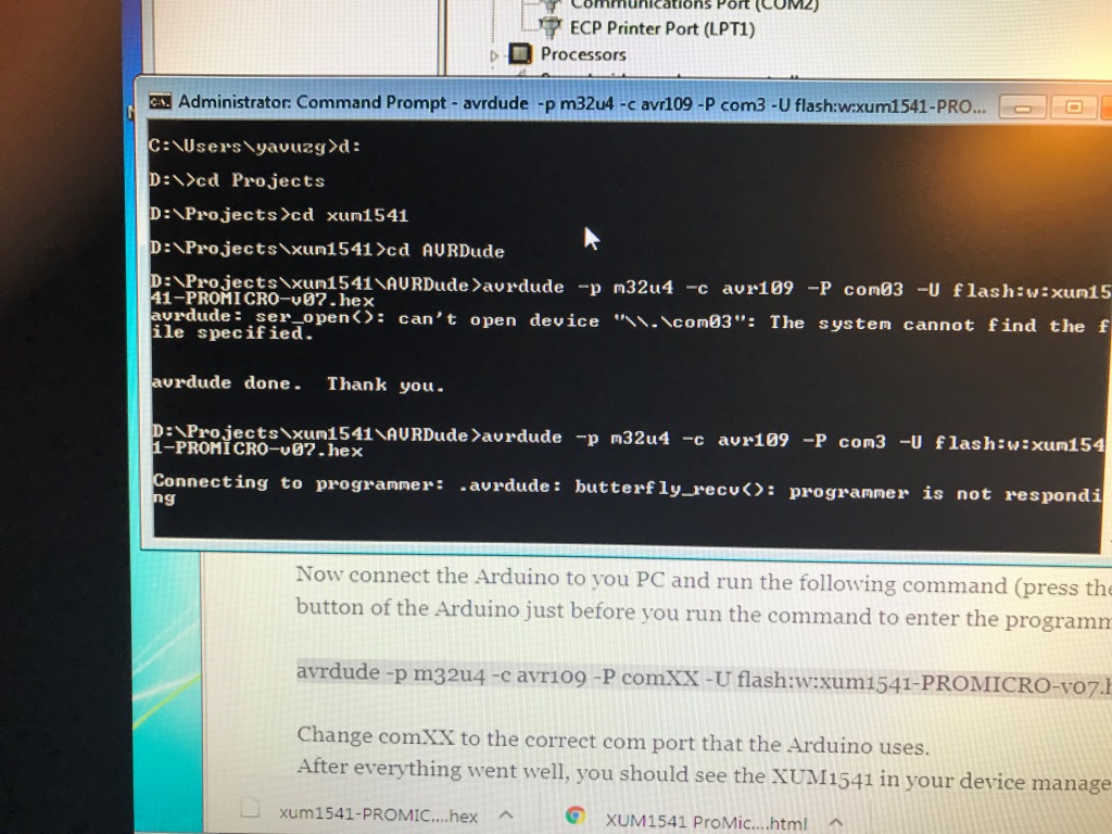 Sonra bil eliniz reset butonunda, Windows Device Manager arkada açık vaziyette, diğer eliniz de avrdude komut satırında hazır beklerken reset butonuna basın...