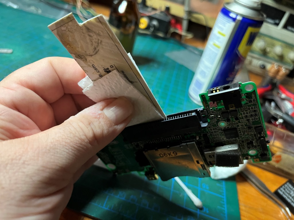 Konnektör kontaklarının önce WD40 sonra alkol (IPA) ile temizlenmesi (burada eski bir kartla fotodaki gibi kesilmiş bir kağıt havlu kullanabilirsiniz)