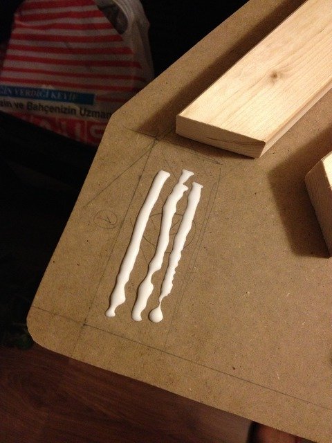 Sonra işimize başlıyoruz. Parçalara ahşap tutkalı sürüp yerine yerleştiriyoruz. Burada ister parçaya tutkal sürün, ister yapışacak yere. Ben bu resimde önce yapışacak yere sürmüştüm, daha sonra parçaya sürmenin daha pratik olduğunu gördüm.